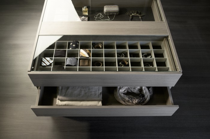 Nicht die kleinen Dinge vergessen! Hüte, Schals, Mützen, Uhren, Schmuck und Krawatten finden auch Ihren Platz. Ein Glasvitrine für den Schmuck der Frau, eine Krawattenschublade für den Mann – alles lässt sich nahtlos integrieren und passt sich perfekt in die Umgebung ein. So haben Sie alle Ihre Lieblingsstücke immer griffbereit.